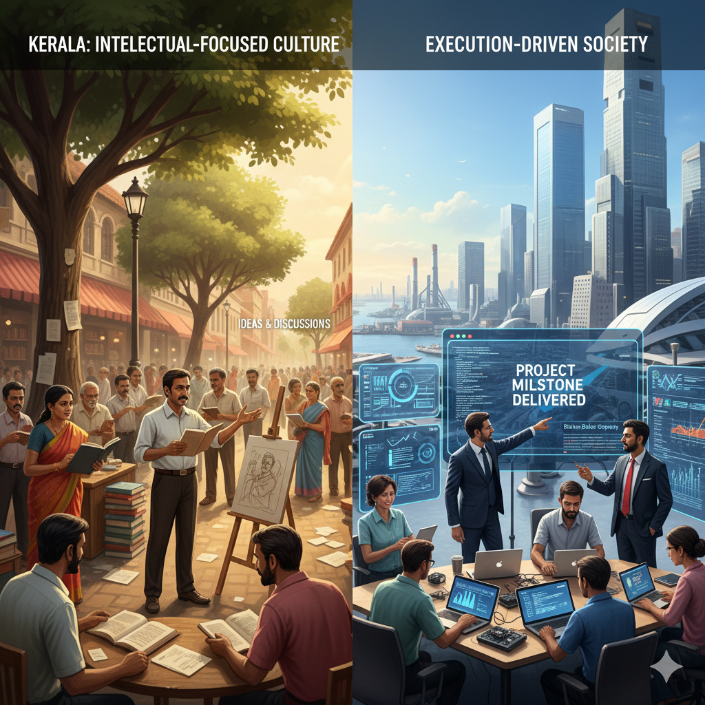 Kerala, long admired for its education, healthcare, and social progress, faces a fundamental challenge in transforming its economic landscape: moving from a culture that celebrates intellectual debate to one that prizes execution, speed, and entrepreneurial results. While neighboring states like Tamil Nadu and Karnataka have leveraged manufacturing, private capital, and startup-friendly ecosystems to drive growth, Kerala historically discouraged private enterprise, overemphasized discussion over action, and created barriers for investors and entrepreneurs. Today, the state is striving to change that narrative—streamlining approvals, establishing industrial corridors, and fostering a culture of fast decision-making and delivery. The shift requires not just government initiative but a broader societal mindset change: valuing execution, scaling businesses, embracing exports, and supporting high-value sectors like IT, deep tech, healthcare, and maritime services. For Kerala to fully realize its potential, intellectual excellence must be paired with a relentless focus on action, investment, and real-world impact.